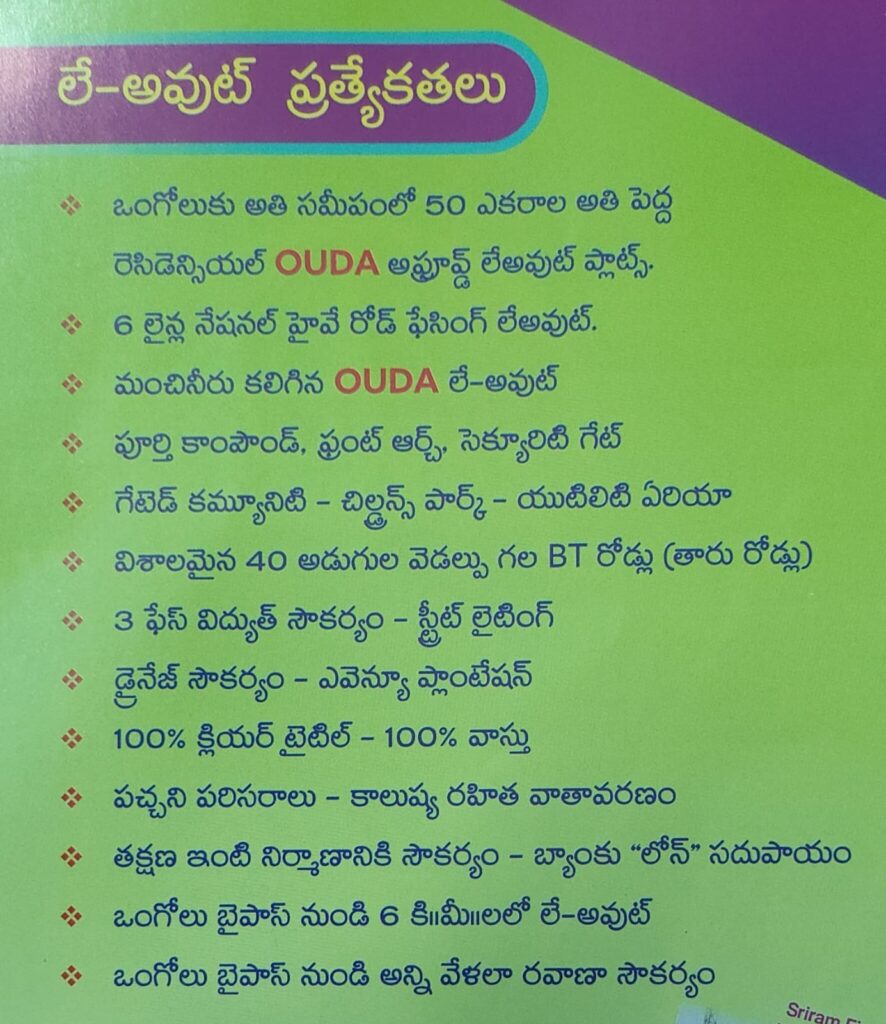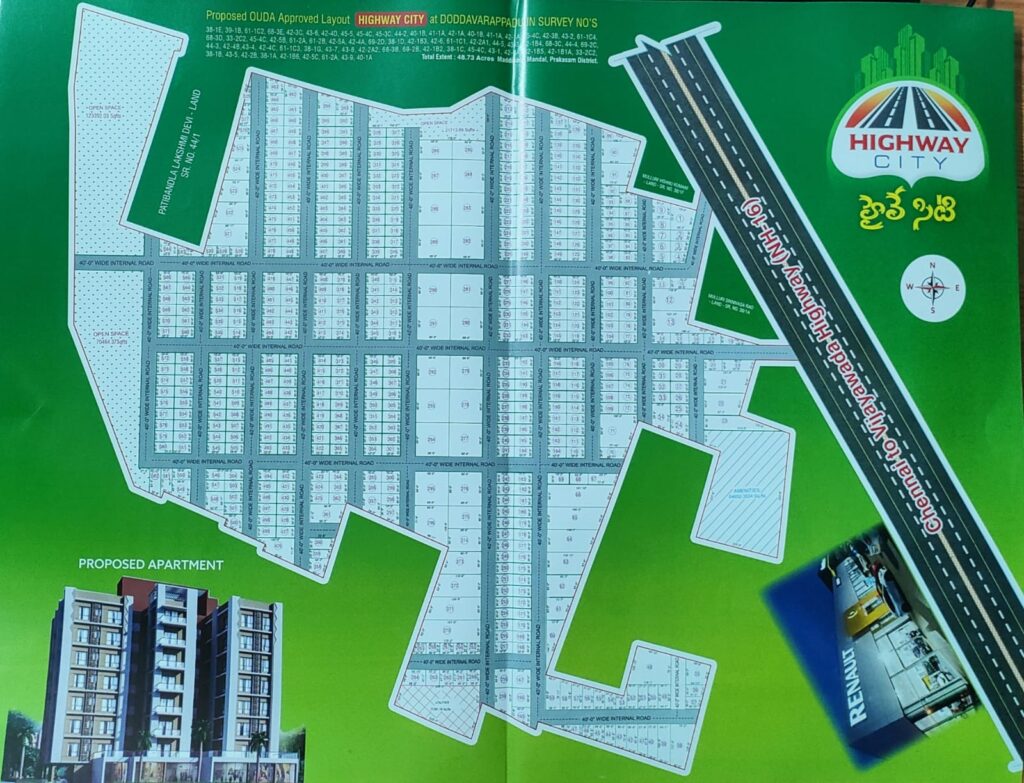 dtcp approved venture at high way facing: ongole Leave a Comment / Apartment, apartment flat, approvedplots, auto nagar, high way ongole, Independent house, kurnool road, ongole, ongole plots, Open land, real estate investment, throvagunta / By srivedaongole ఒంగోలు లో ఏడుగుండ్లపాడు గ్రామానికి సమీపం లో హైవే ను ఆనుకొని 50 ఎకరాల వెంచర్ కలదు. Features of the venture: 50 ఎకరాల విశాలమైన వెంచర్. NH 5 హైవే ను ఆనుకొని ఉన్న వెంచర్. 👉40 అడుగుల వెడల్పు గల అంతర్గత రోడ్లు. 👉 తూర్పు, పడమర facing కలిగిన ప్లాట్స్. electricity facility and street lights. అంతర్గత తారు రోడ్లు. చుట్టూ ప్రహరీ గోడ, ఆర్చ్, సెక్యూరిటీ గేట్స్.., అవెన్యూ ప్లాంటేషన్. కామన్ స్పేస్ మరియు యుటీలిటీస్ కోసం 5 ఎకరాలకు కు పైగా స్థలం అందుబాటులో ఉండును. SEND 'HI' IN WHATSAPP CLICK THE LINK BELOW Contact Us:94923209056305893063
